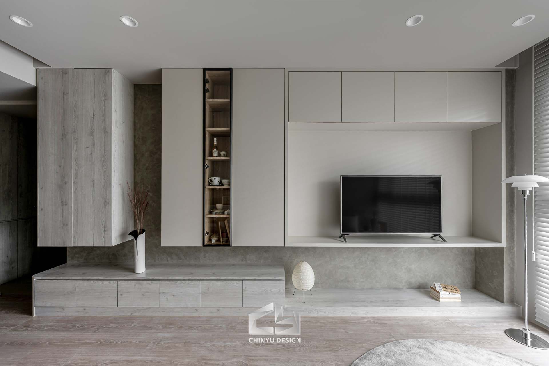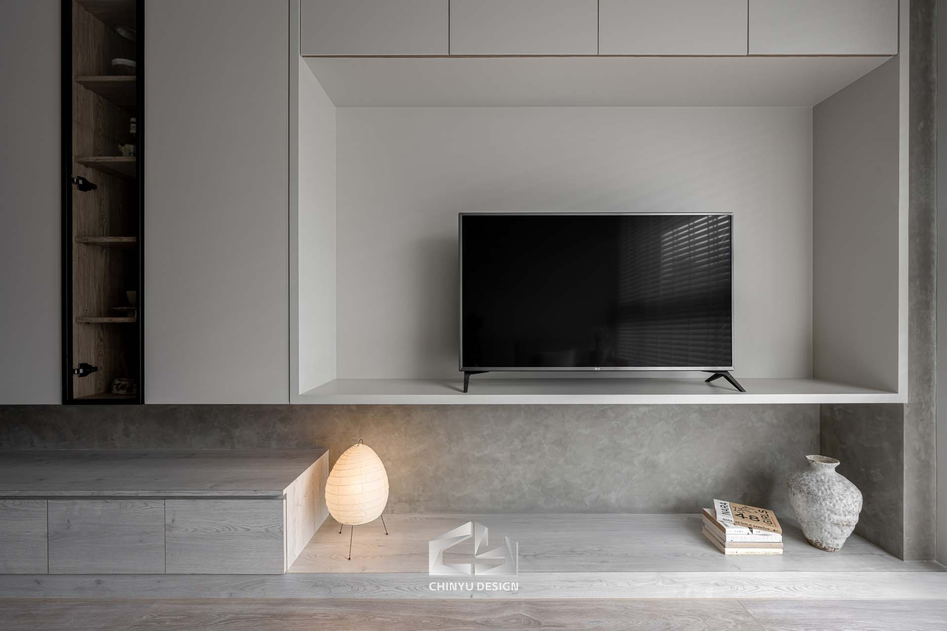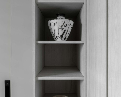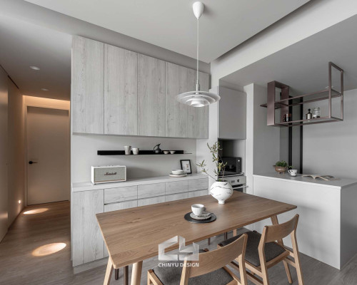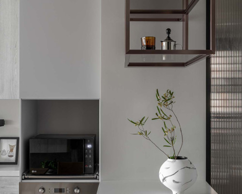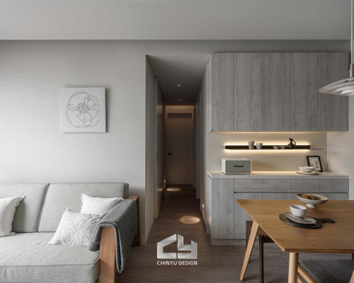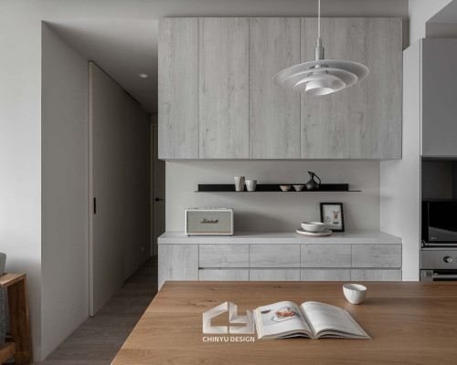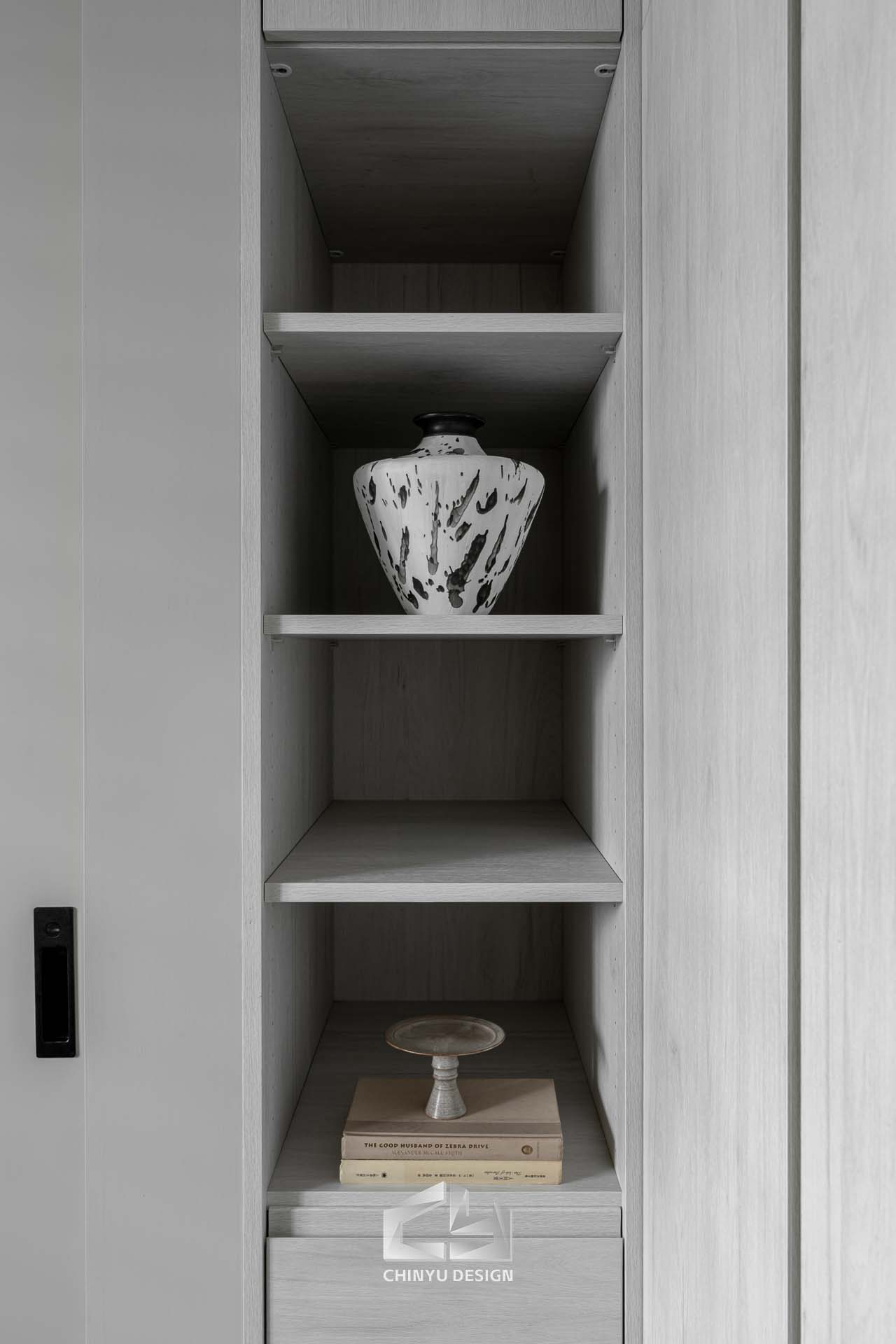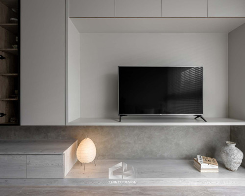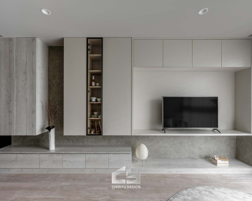 以收納與展示為核心的住宅設計。屋主熱愛旅行,家中需要足夠空間收藏各地帶回的紀念品,因此我們在櫃體規劃中融入玻璃展示與懸浮結構,保持視覺輕盈的效果。
