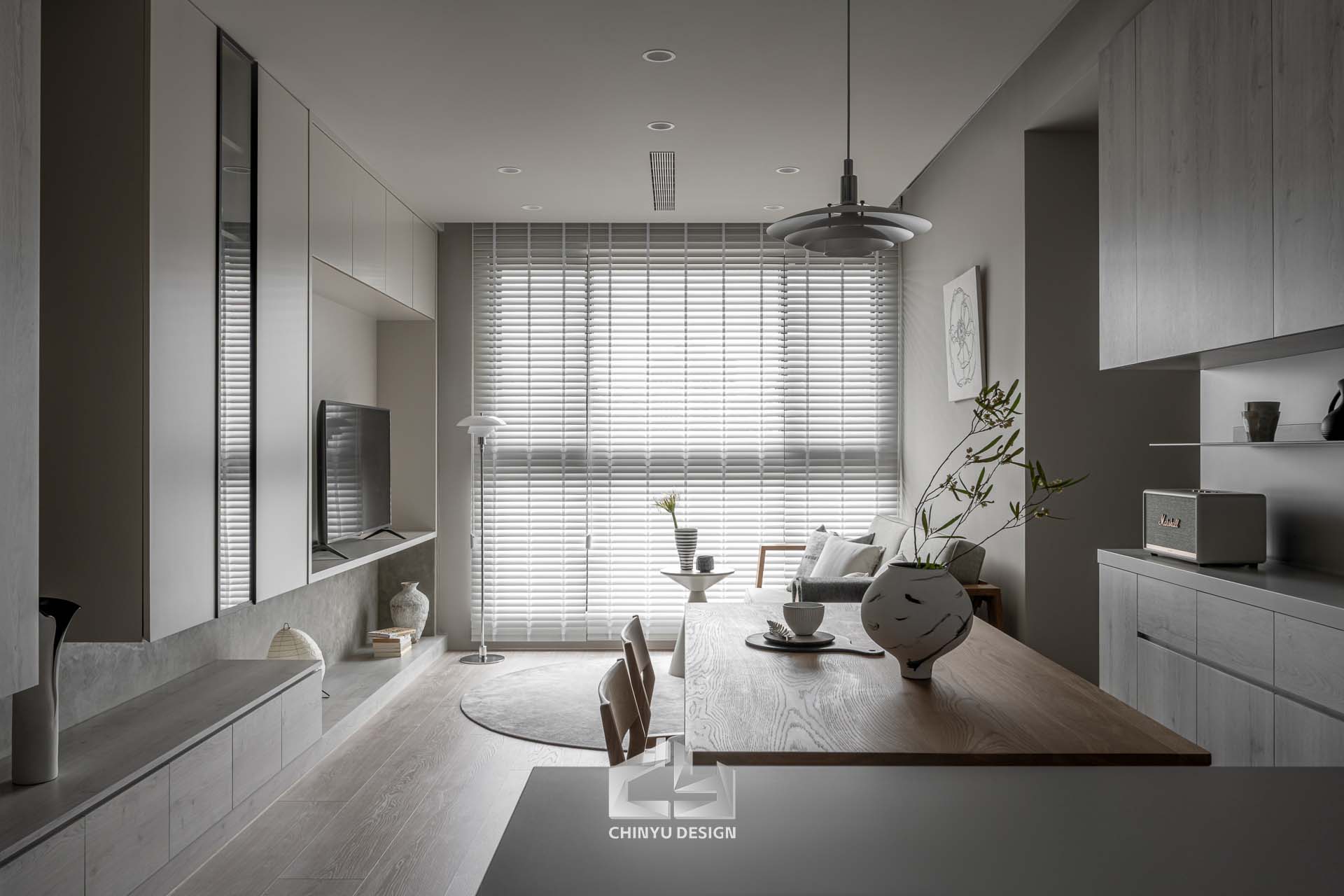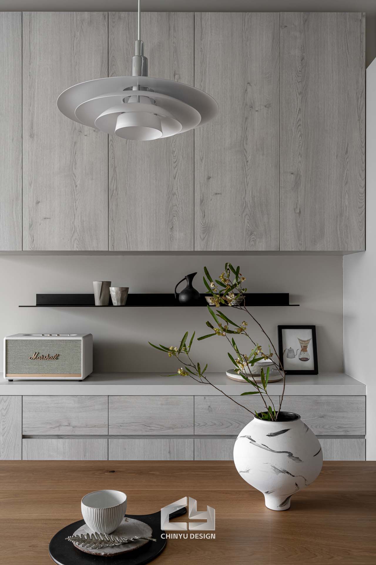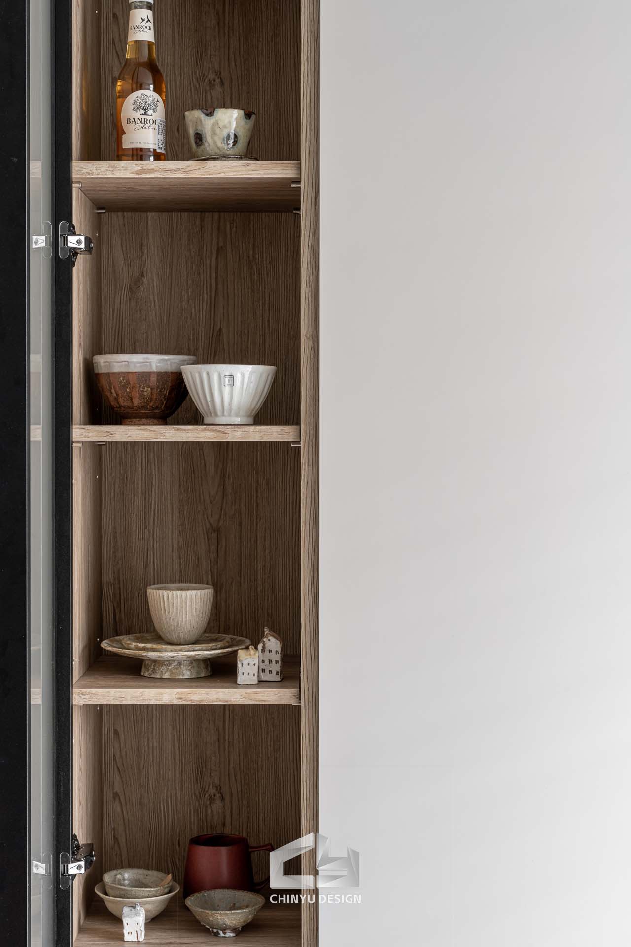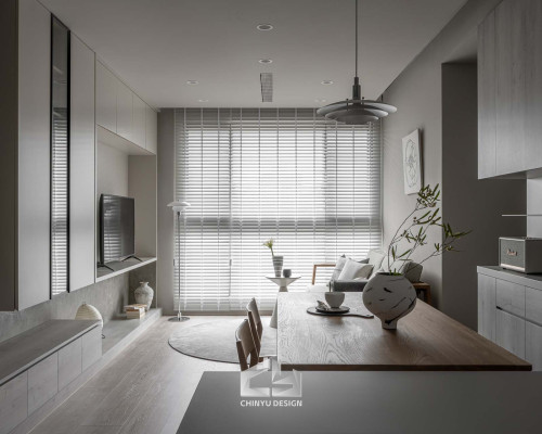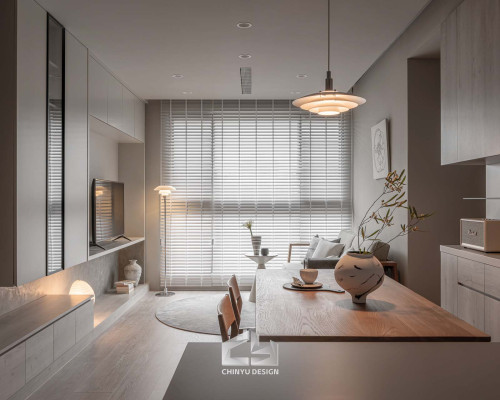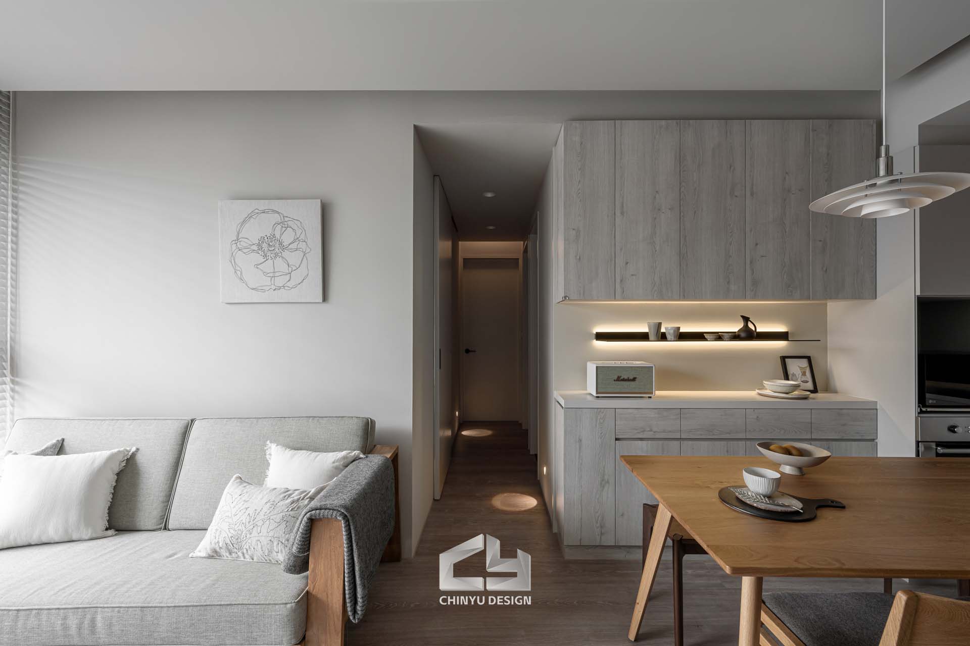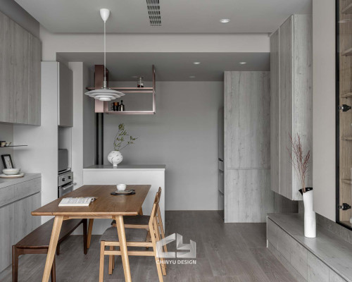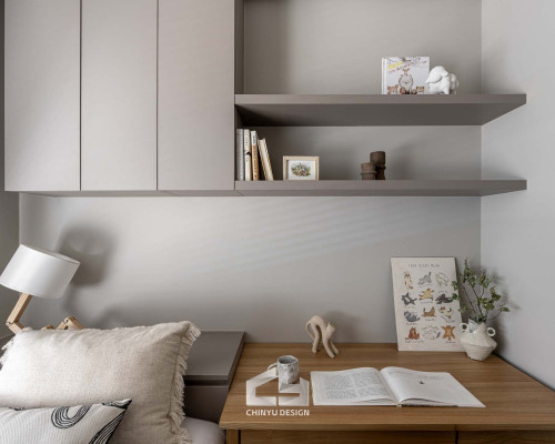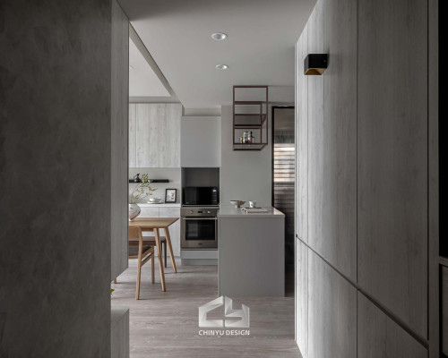 以收納與展示為核心的住宅設計。屋主熱愛旅行,家中需要足夠空間收藏各地帶回的紀念品,因此我們在櫃體規劃中融入玻璃展示與懸浮結構,保持視覺輕盈的效果。