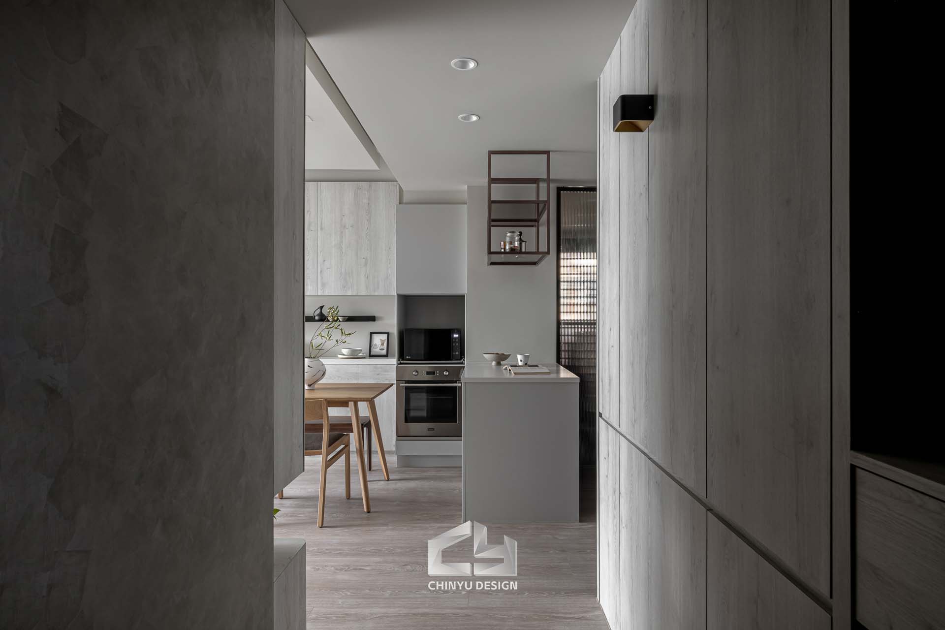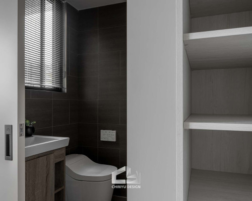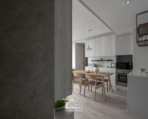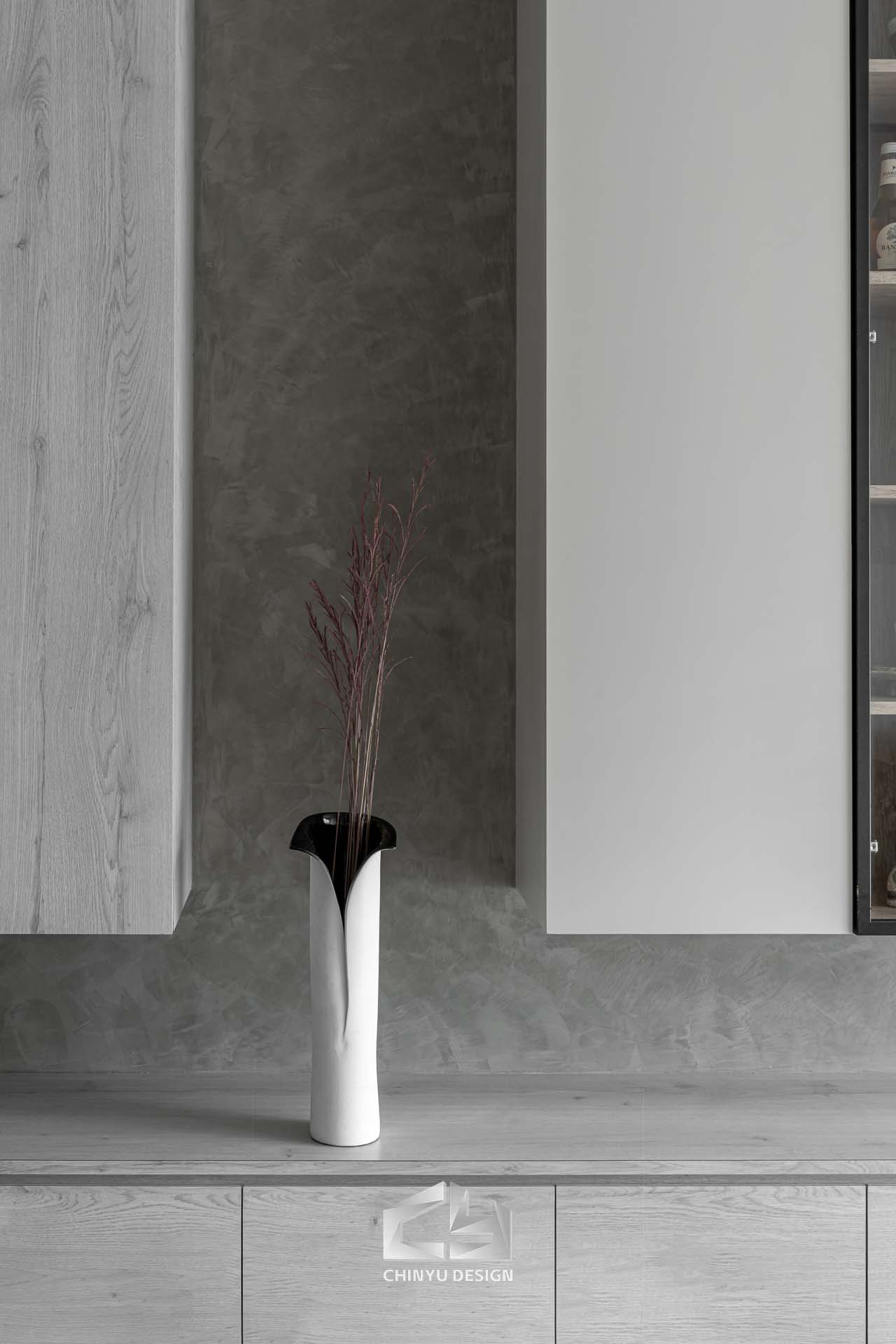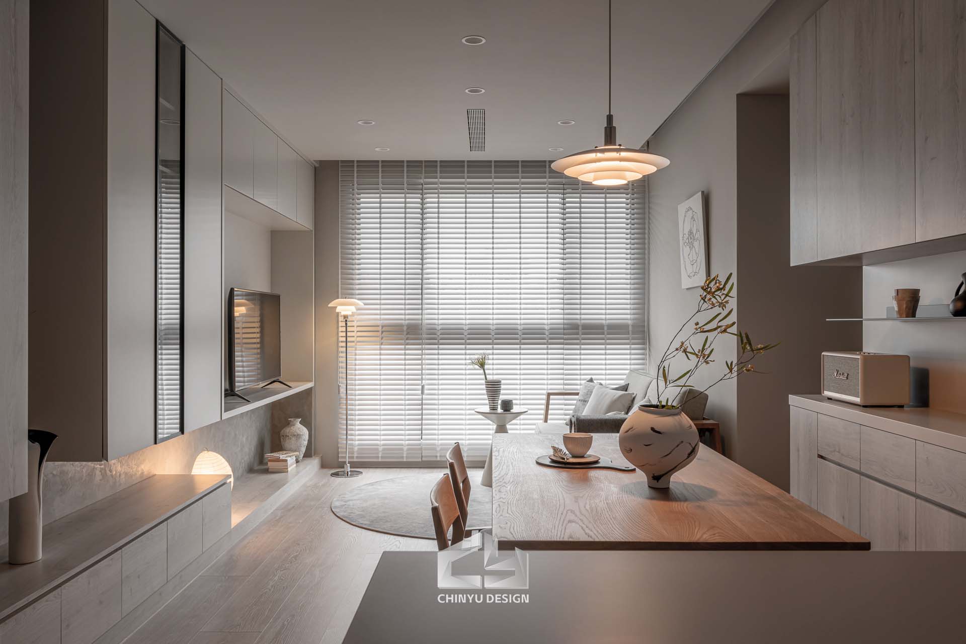 以收納與展示為核心的住宅設計。屋主熱愛旅行,家中需要足夠空間收藏各地帶回的紀念品,因此我們在櫃體規劃中融入玻璃展示與懸浮結構,保持視覺輕盈的效果。