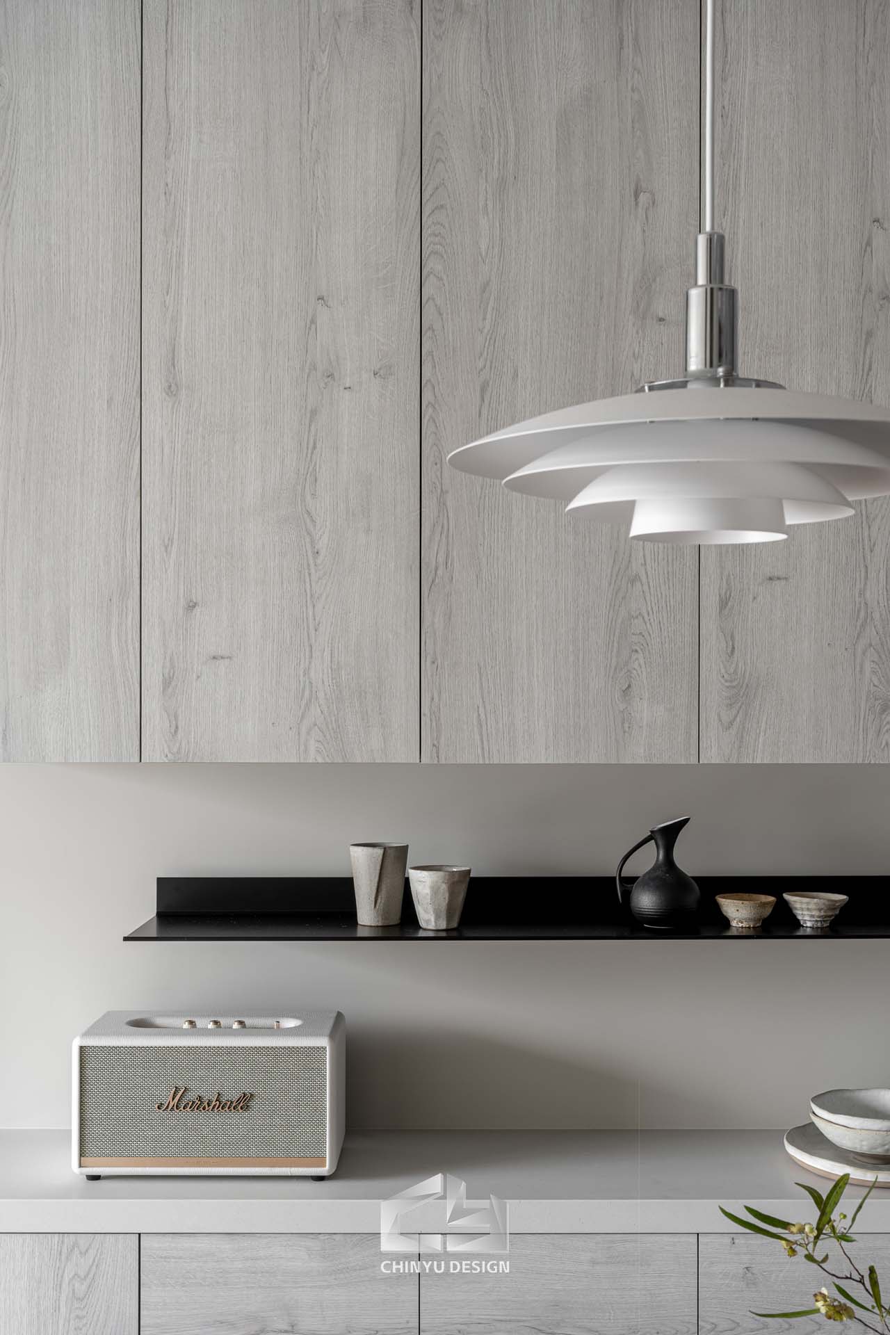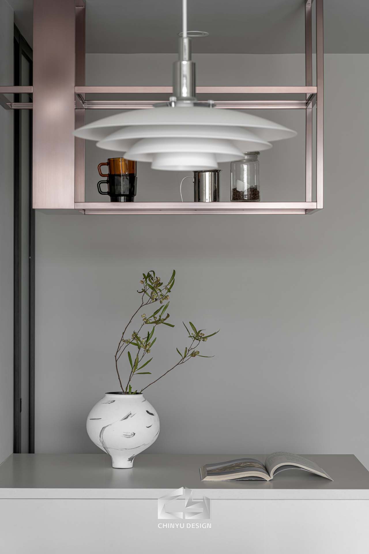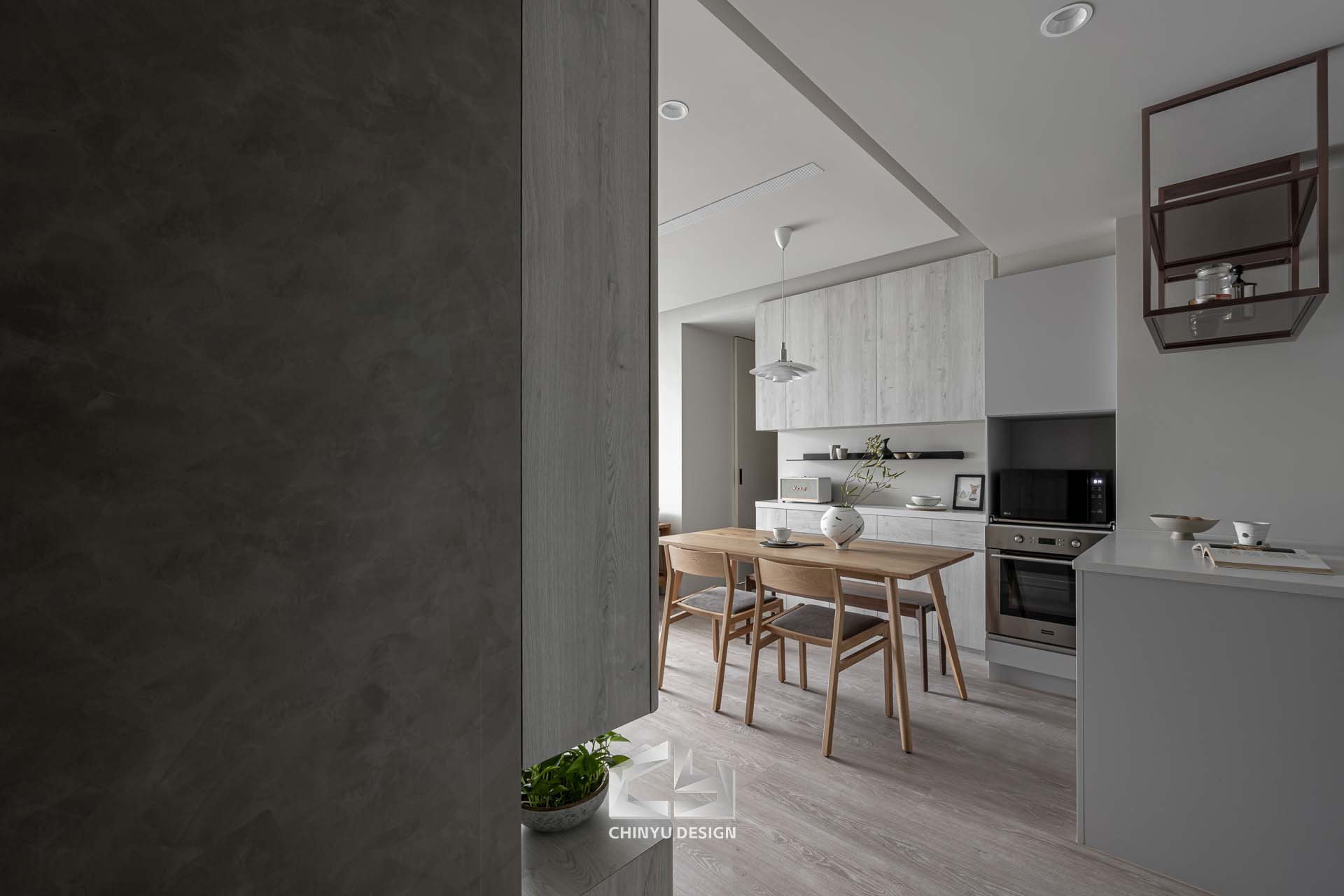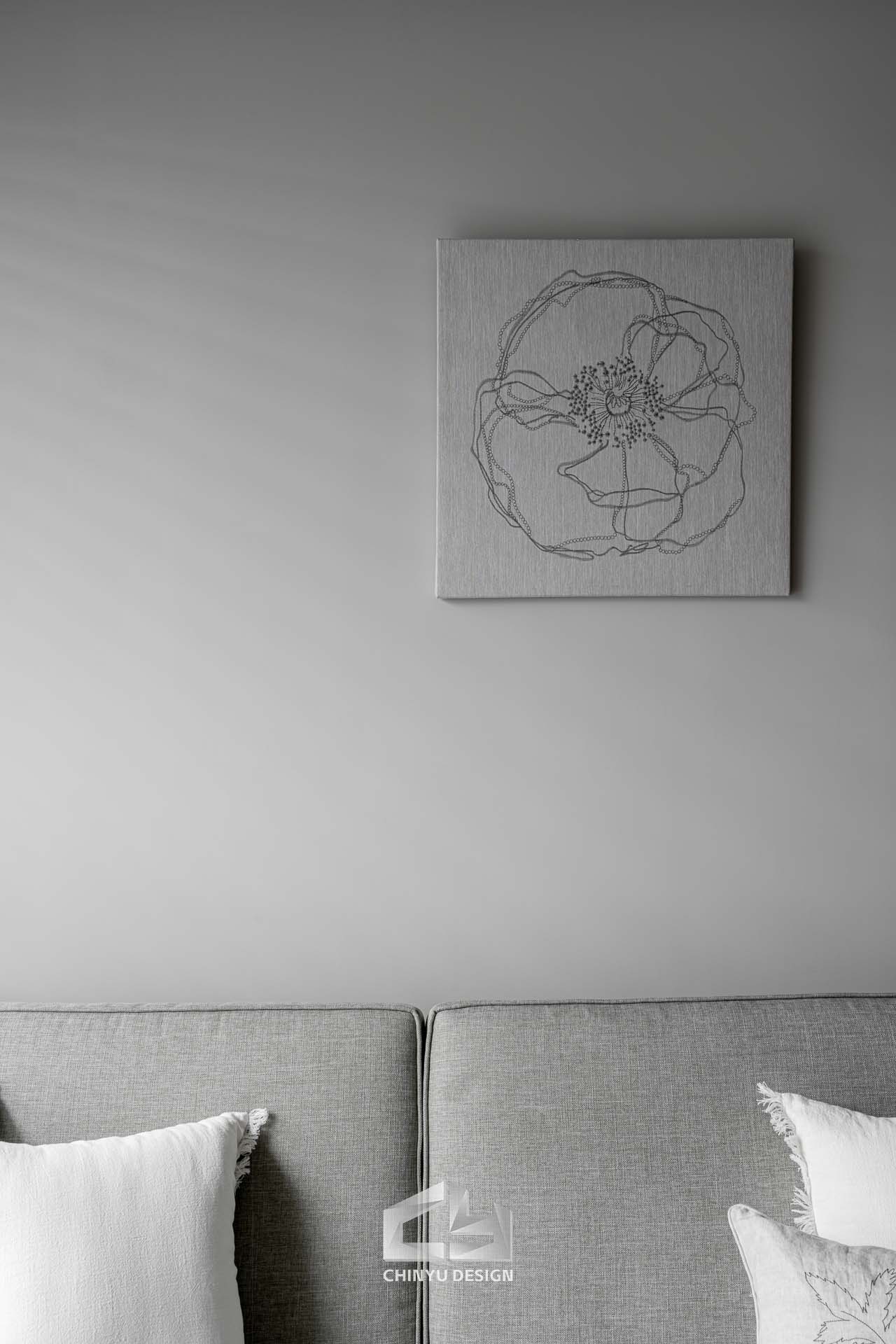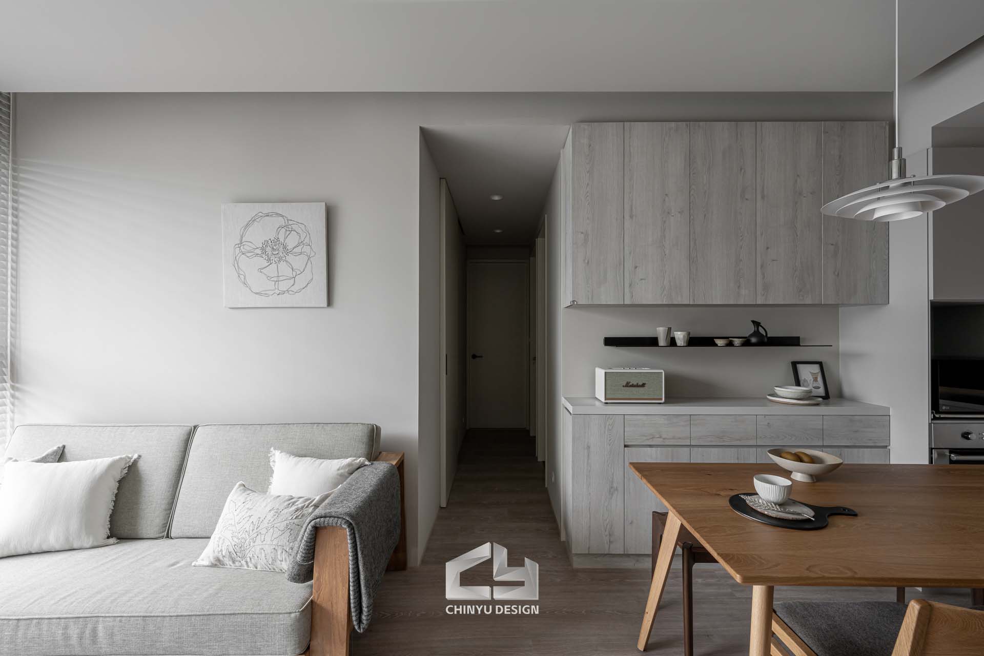 以收納與展示為核心的住宅設計。屋主熱愛旅行,家中需要足夠空間收藏各地帶回的紀念品,因此我們在櫃體規劃中融入玻璃展示與懸浮結構,保持視覺輕盈的效果。