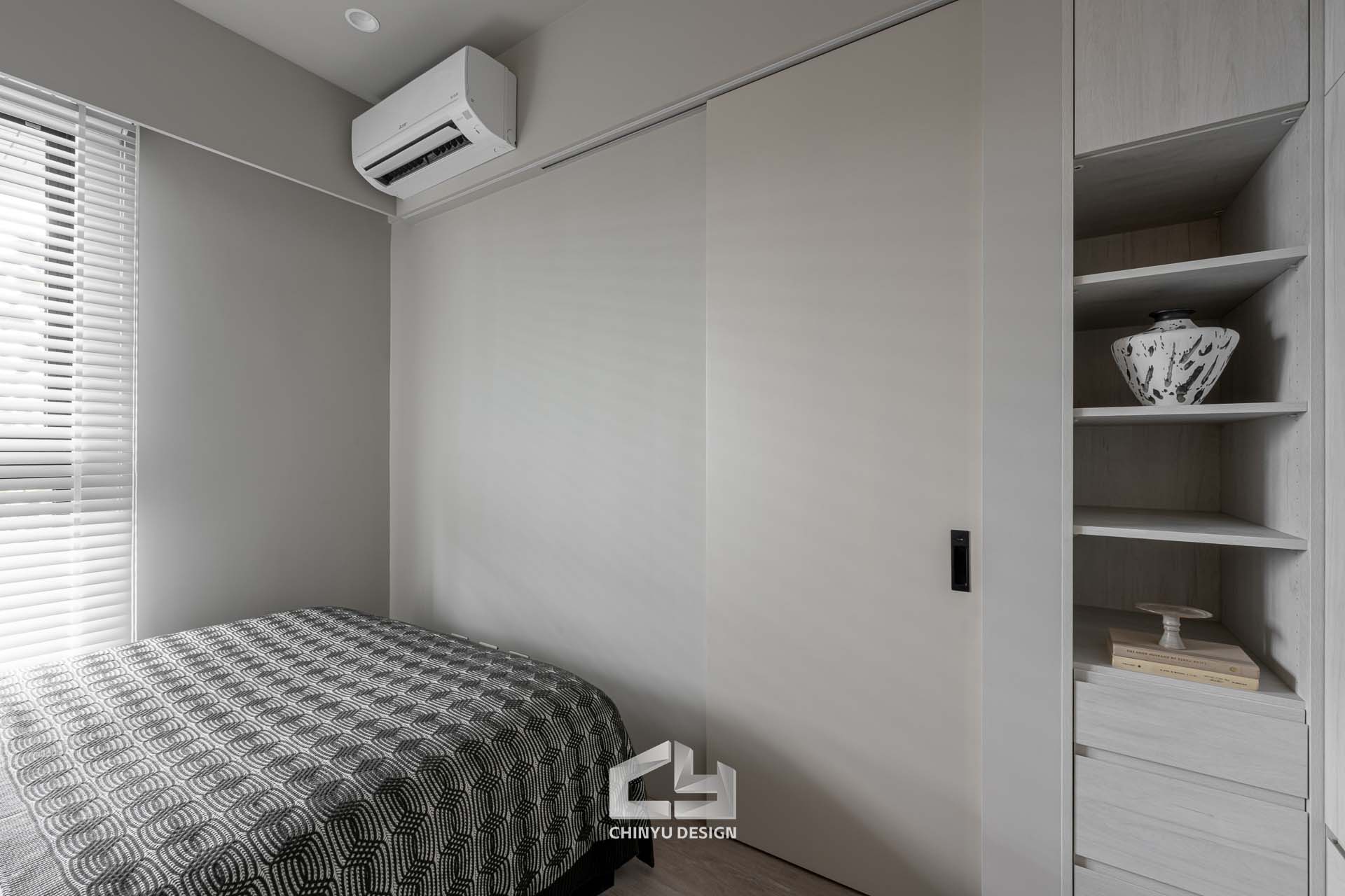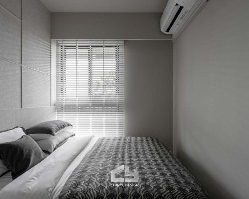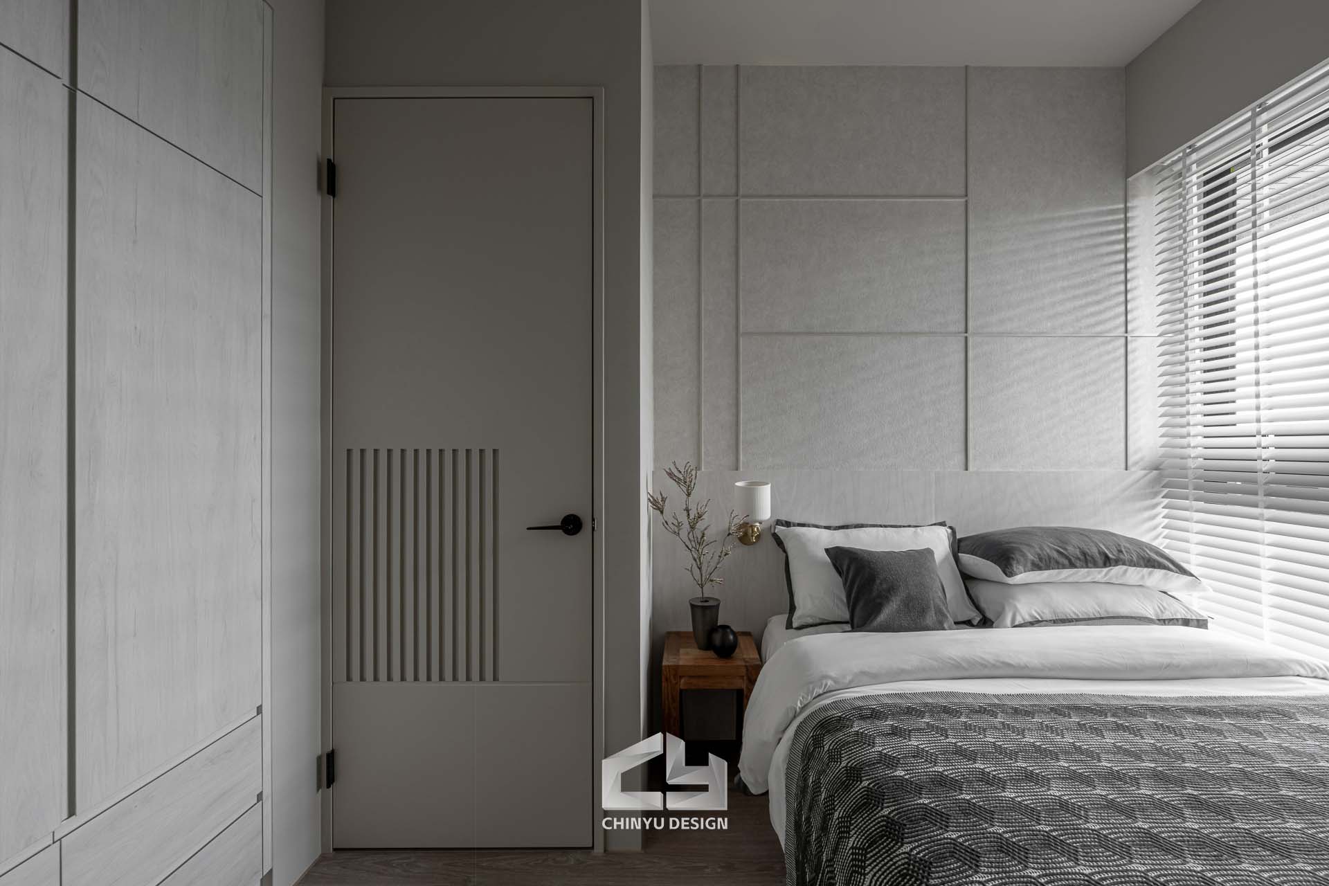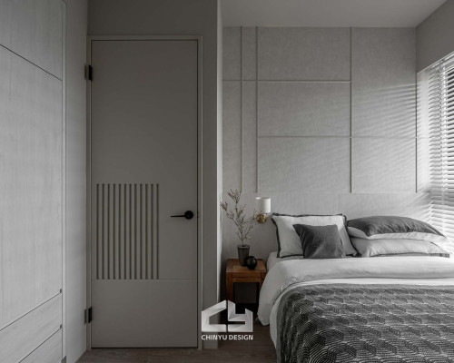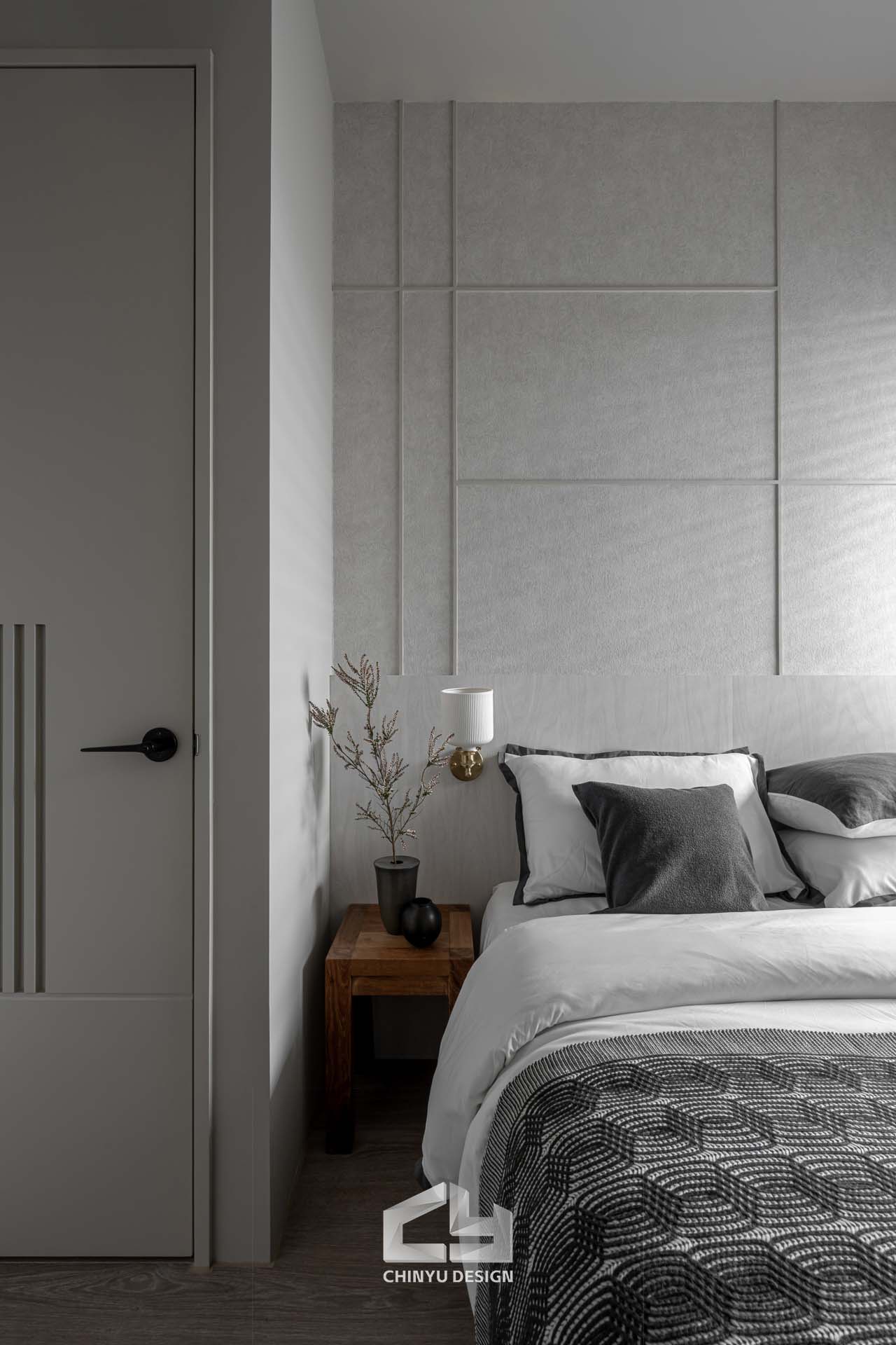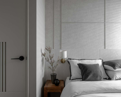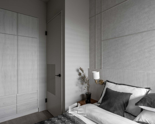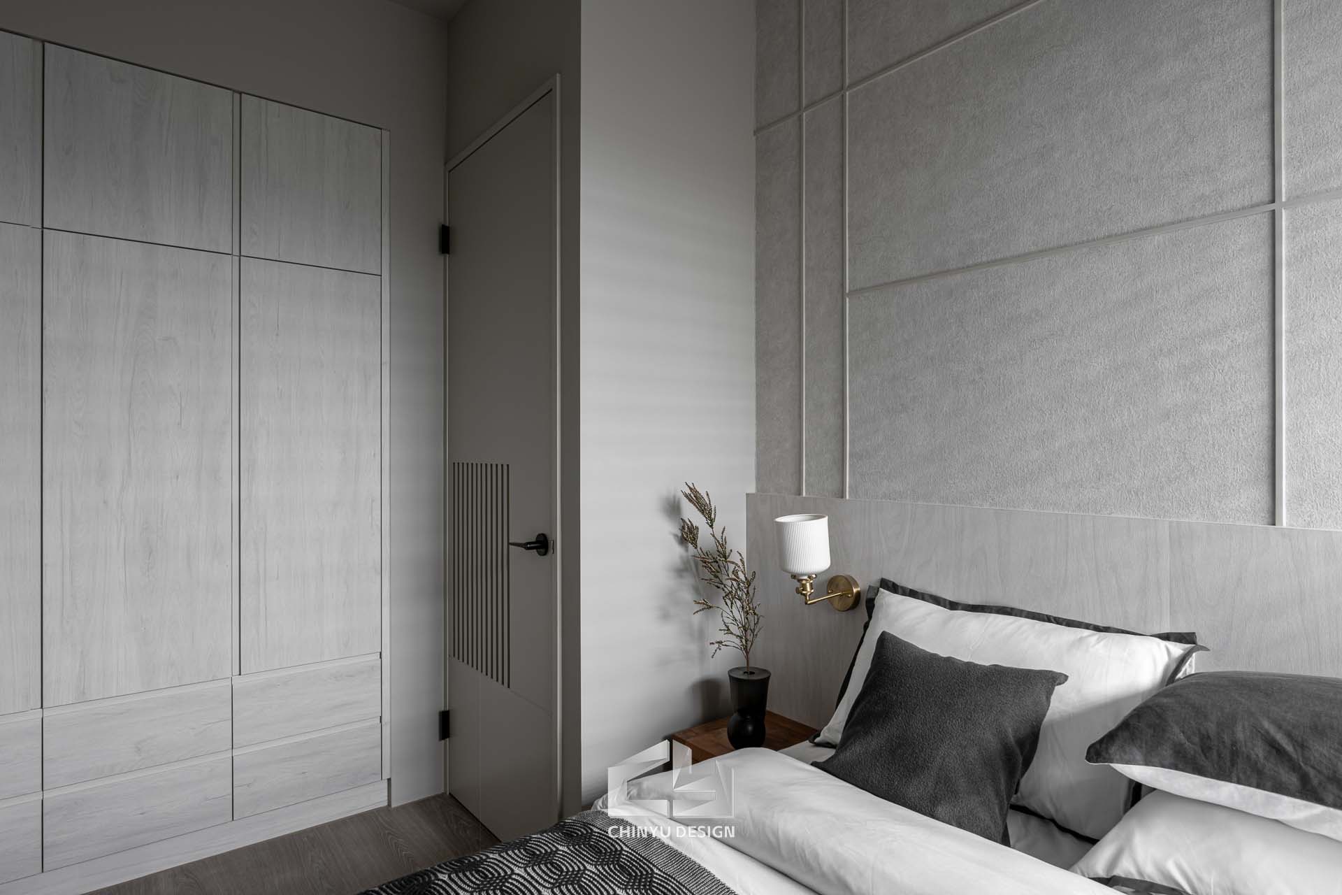 臥室整體以灰白色調做主色,加上壁紙與實木的線條設計,讓小空間保持清爽,搭配木質家具讓空間更溫暖有層次。