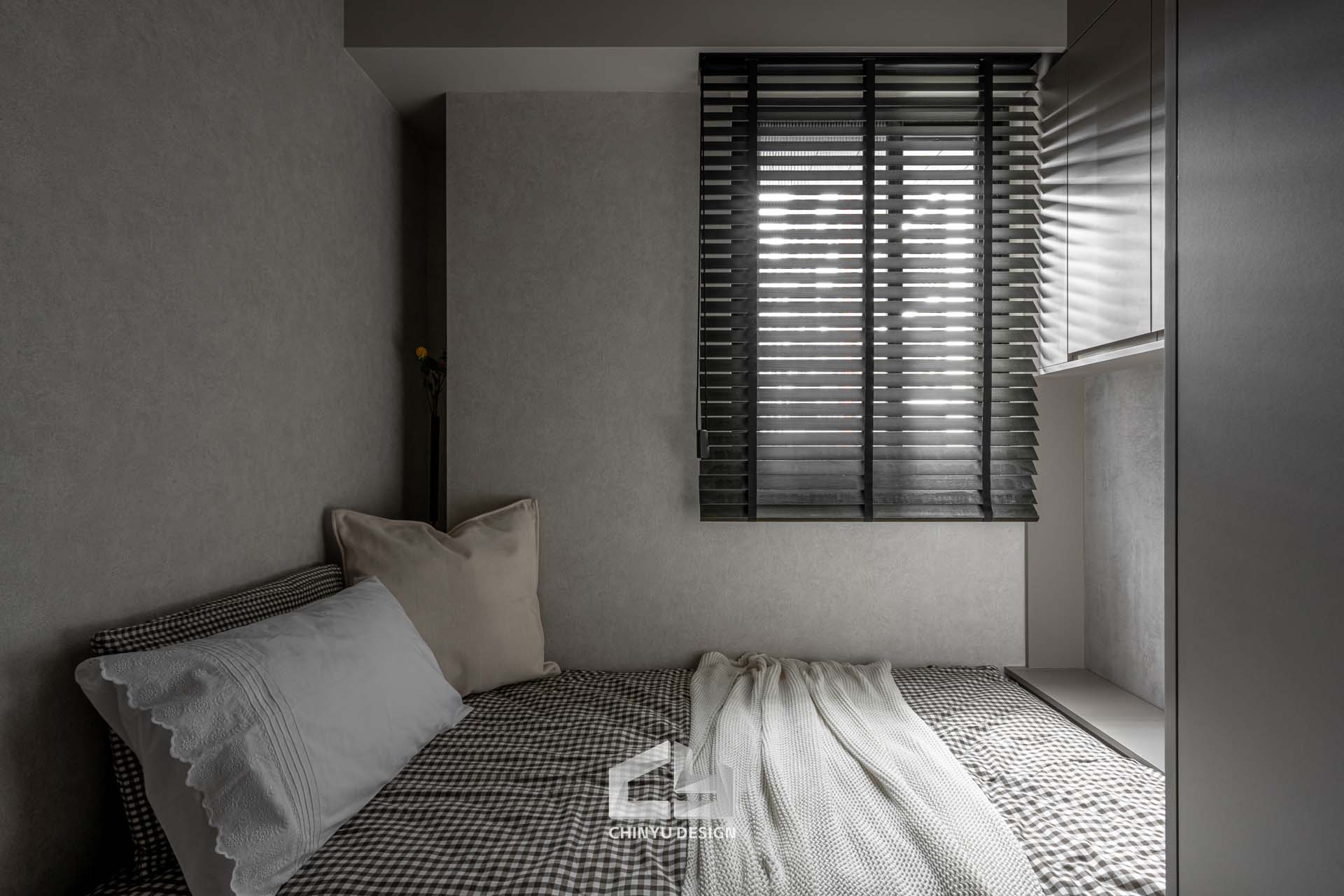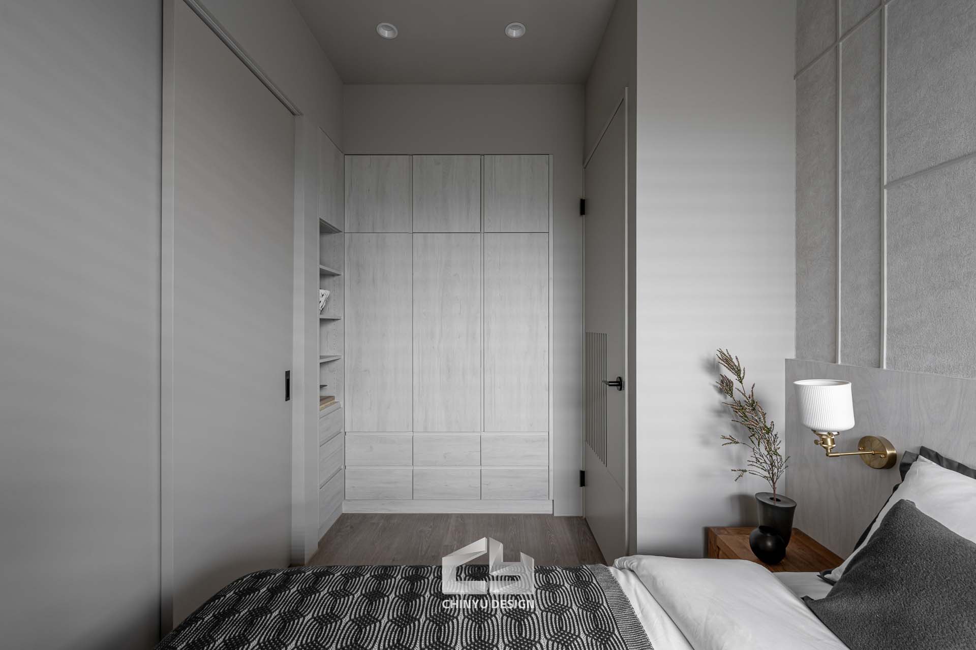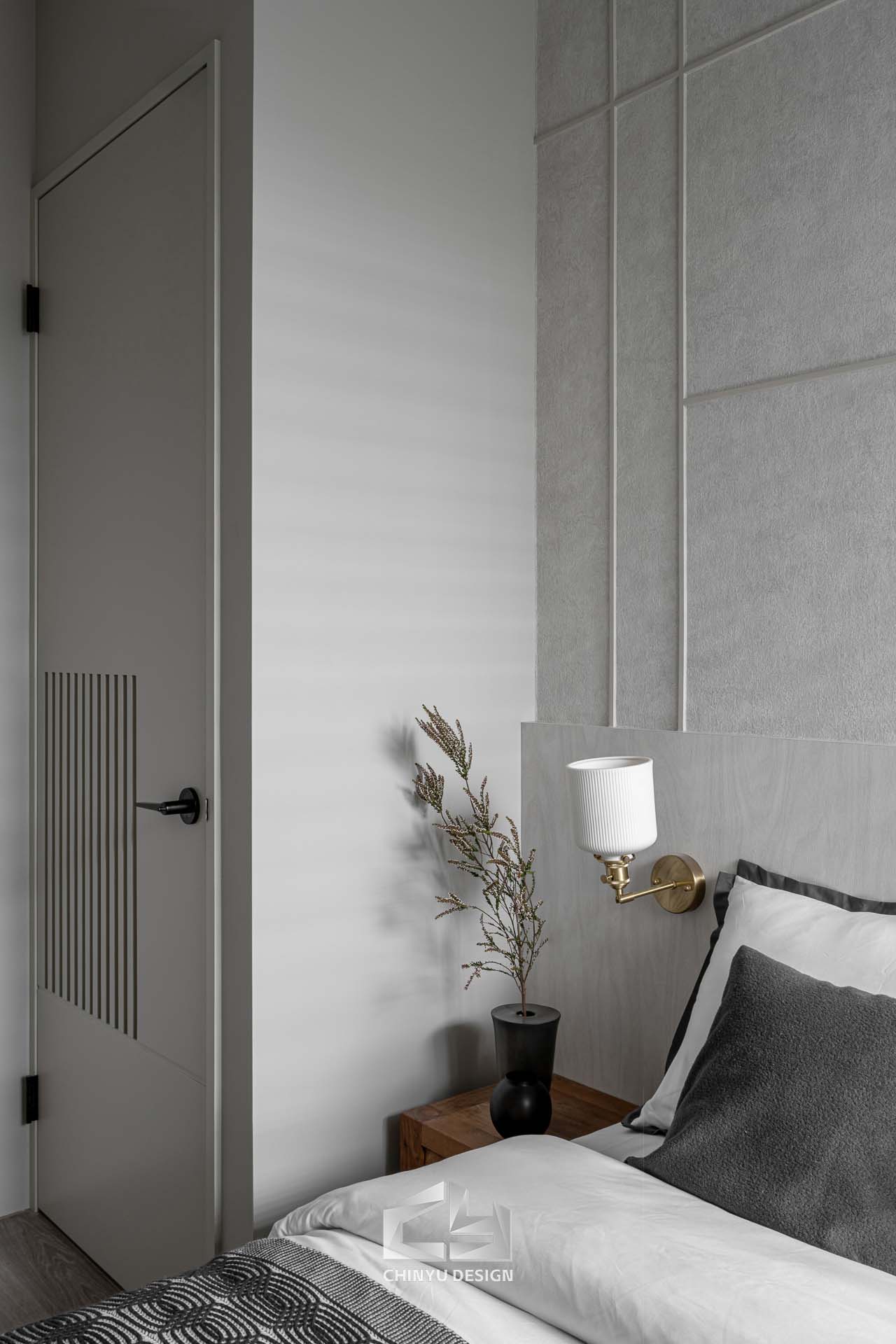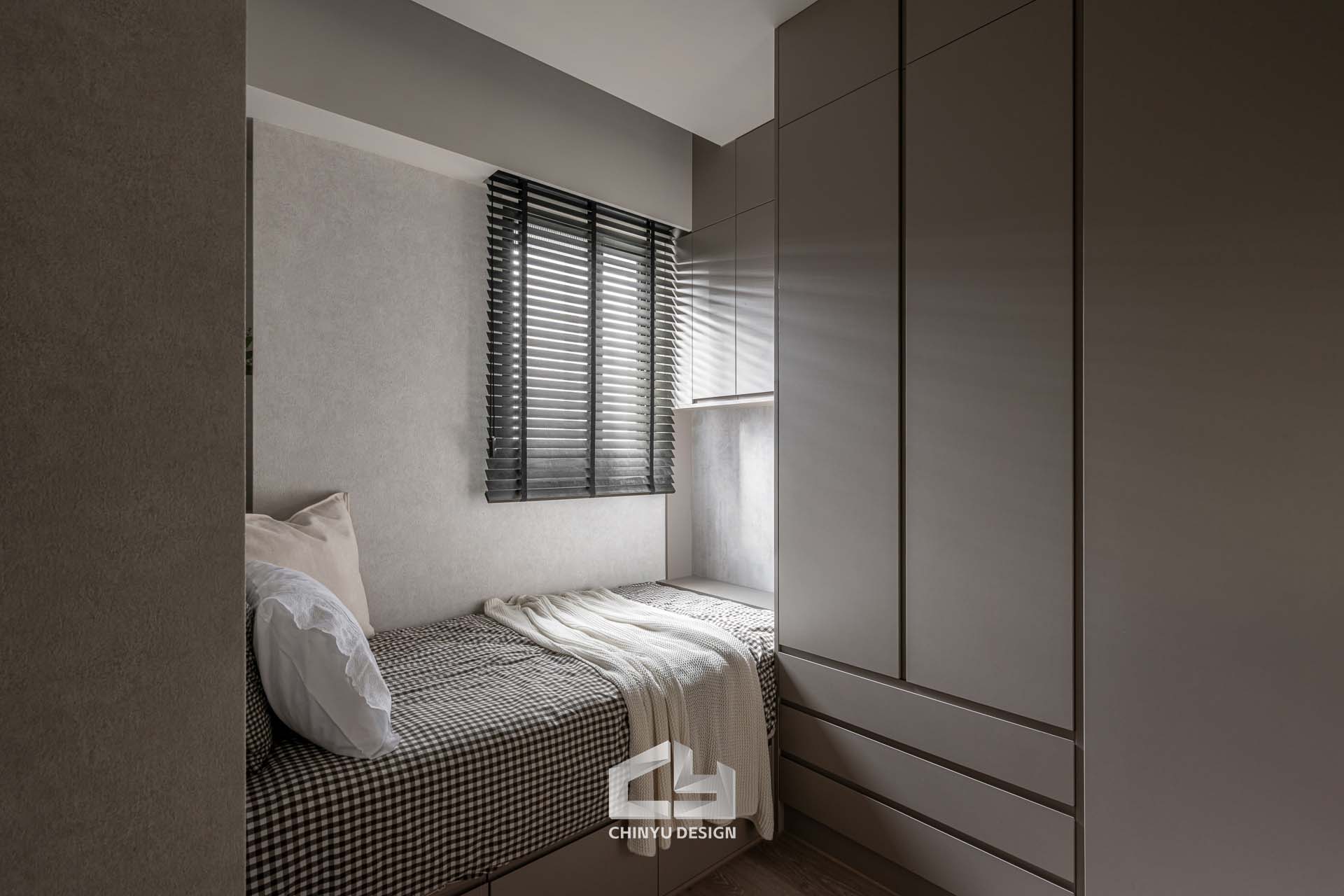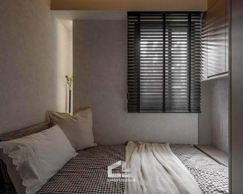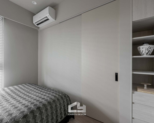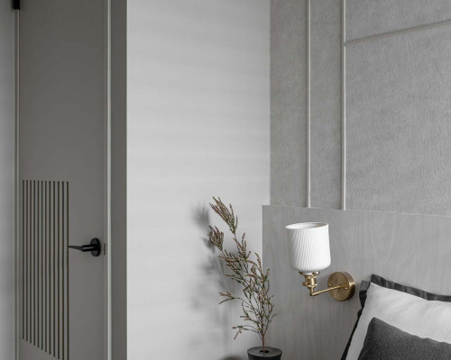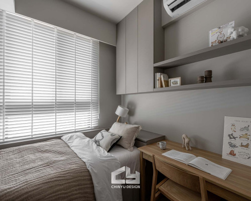 臥室整體以灰白色調做主色,加上壁紙與實木的線條設計,讓小空間保持清爽,搭配木質家具讓空間更溫暖有層次。