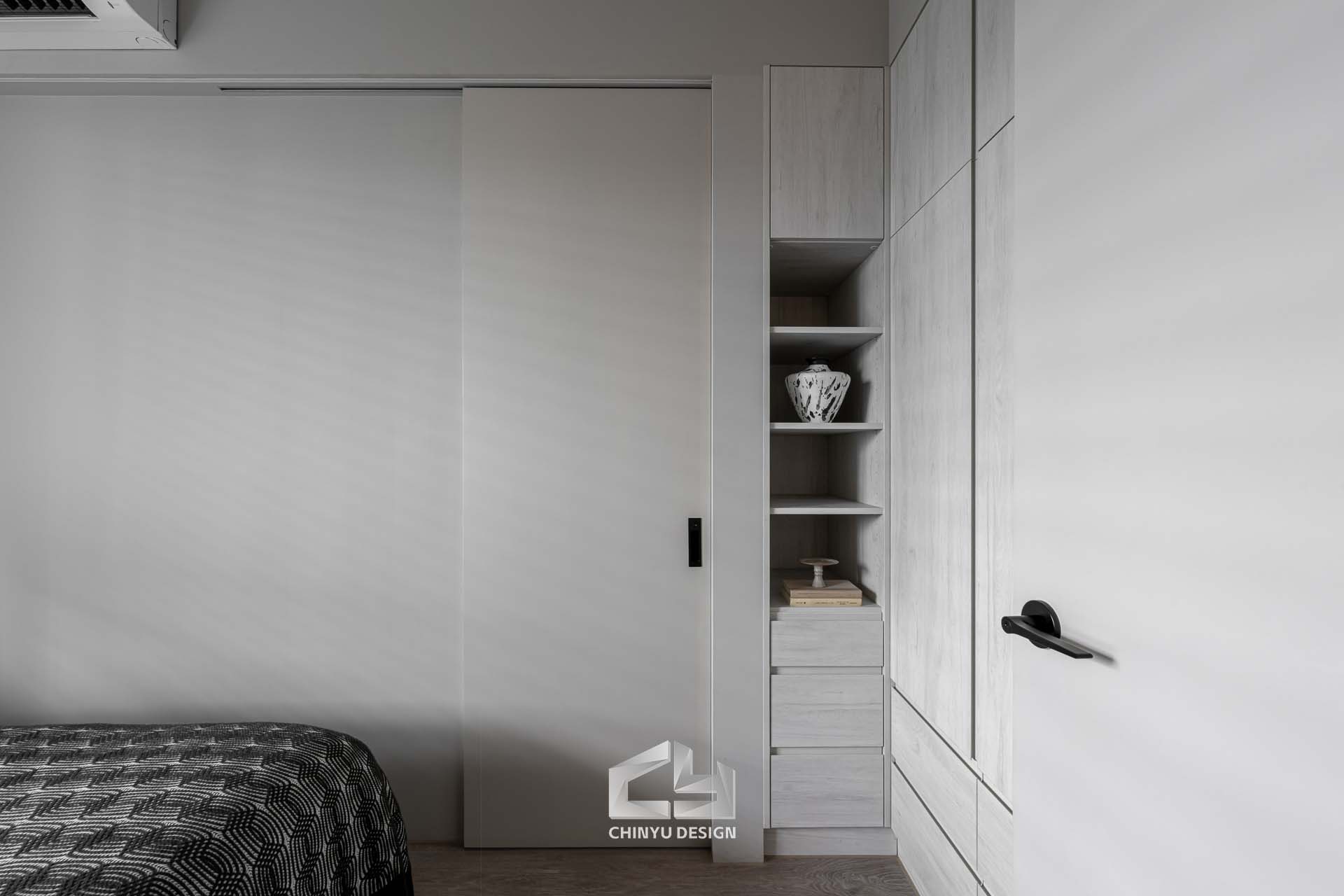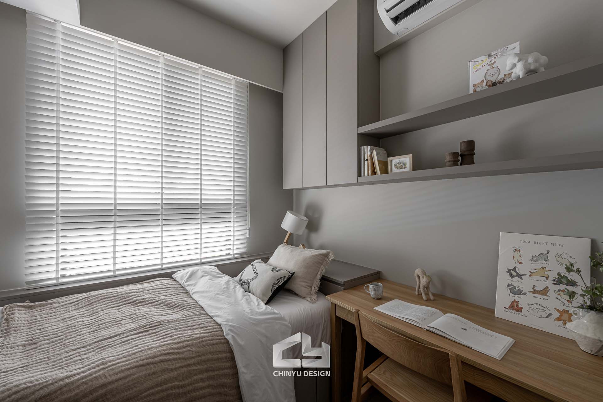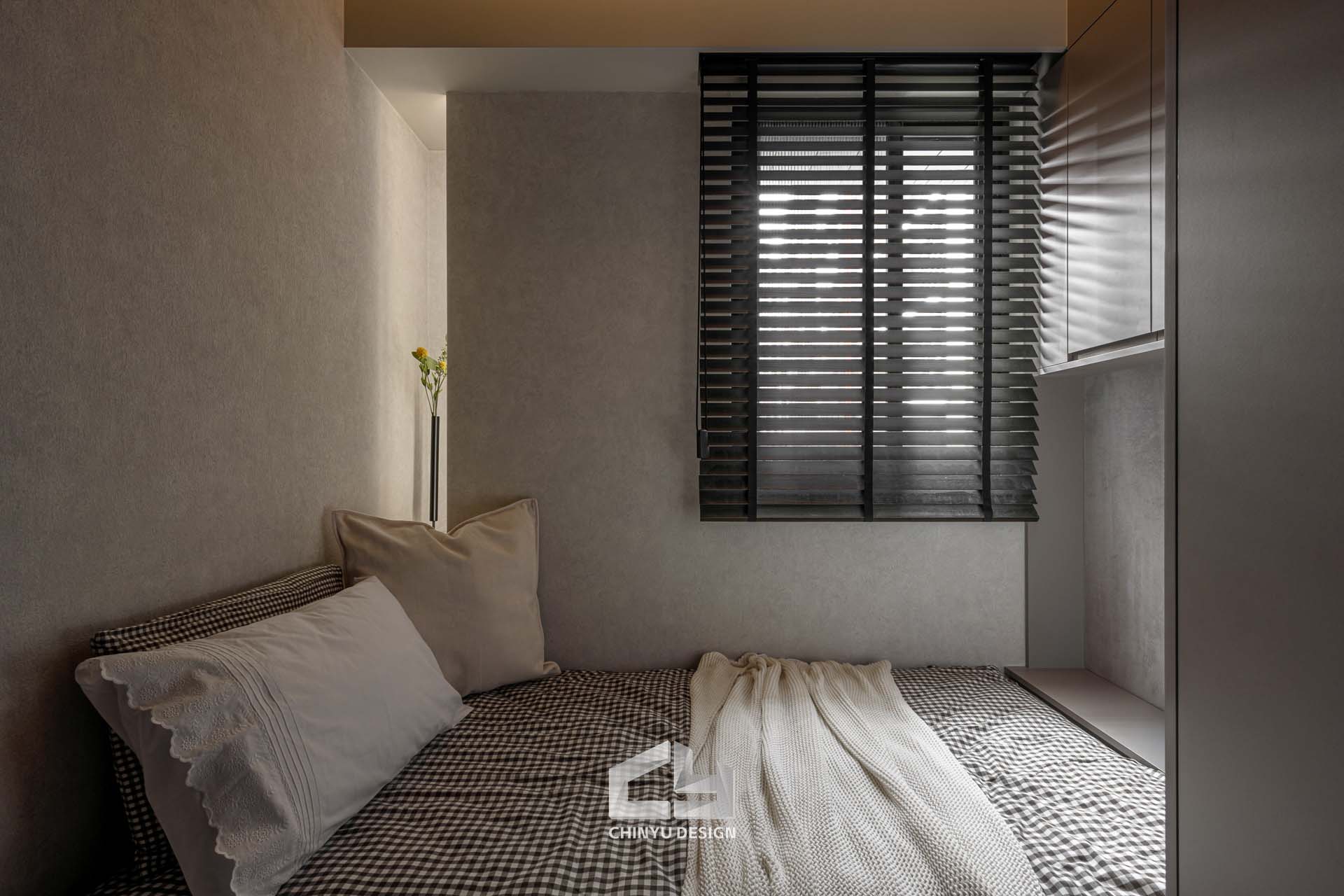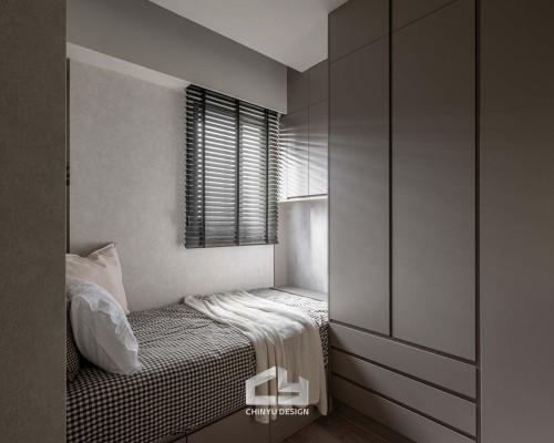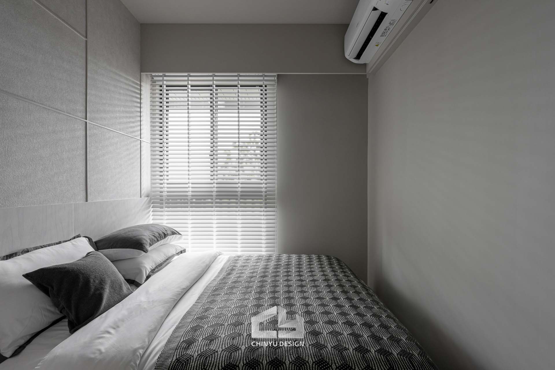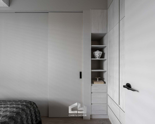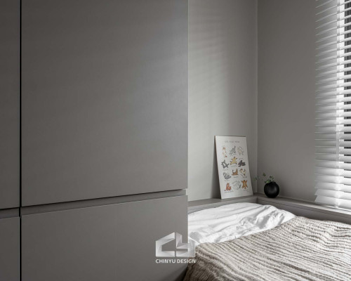 臥室整體以灰白色調做主色,加上壁紙與實木的線條設計,讓小空間保持清爽,搭配木質家具讓空間更溫暖有層次。