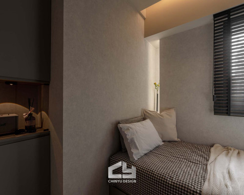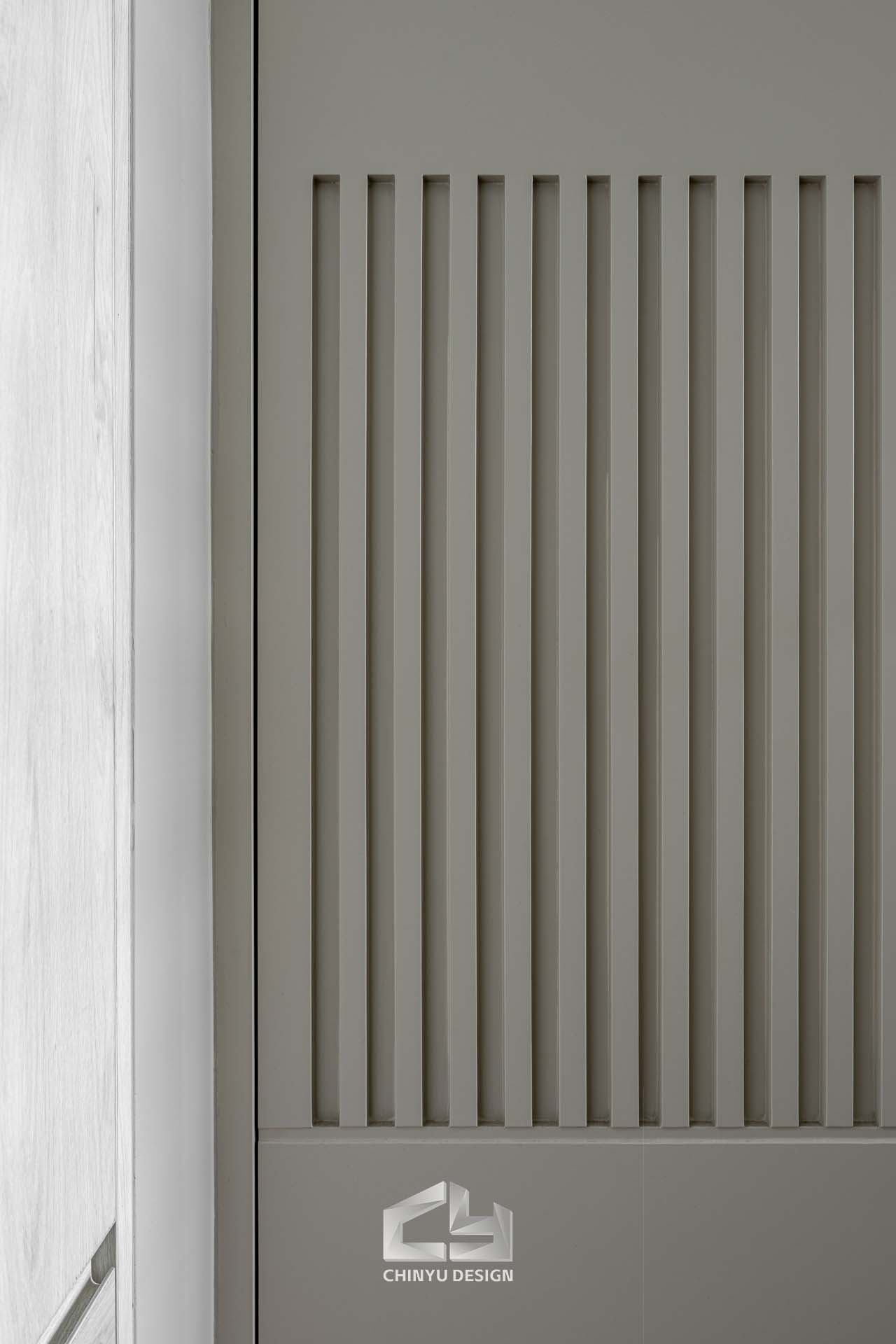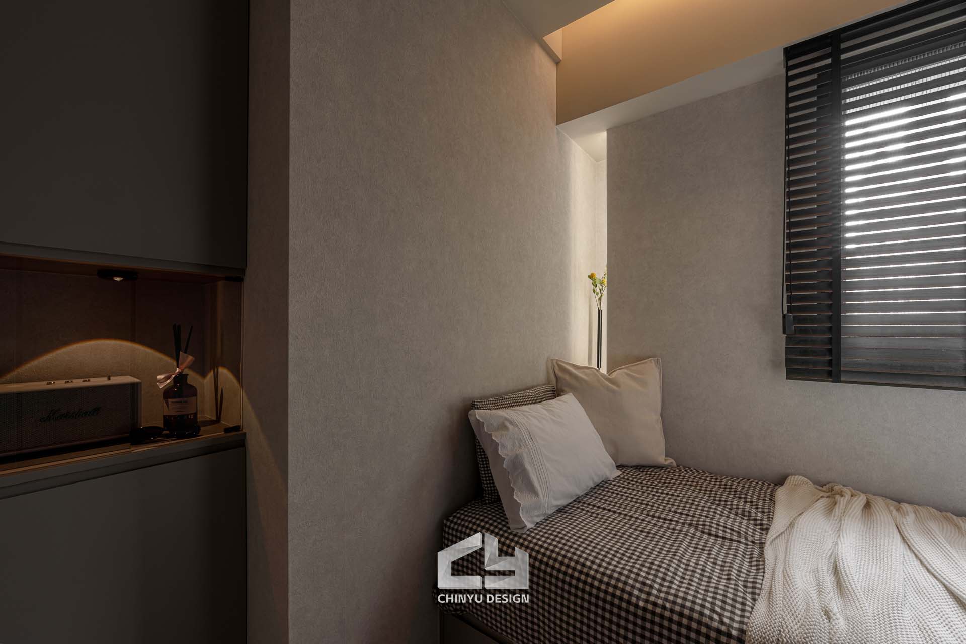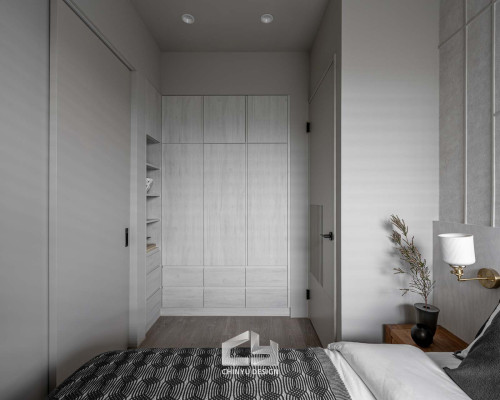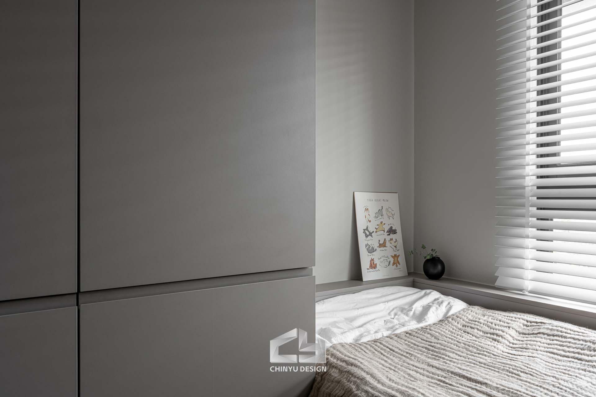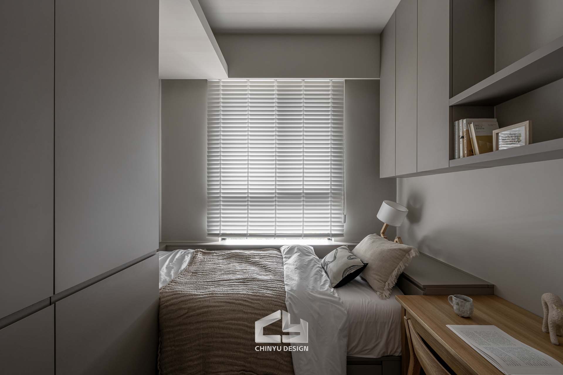 臥室整體以灰白色調做主色,加上壁紙與實木的線條設計,讓小空間保持清爽,搭配木質家具讓空間更溫暖有層次。
