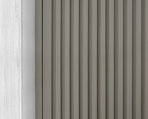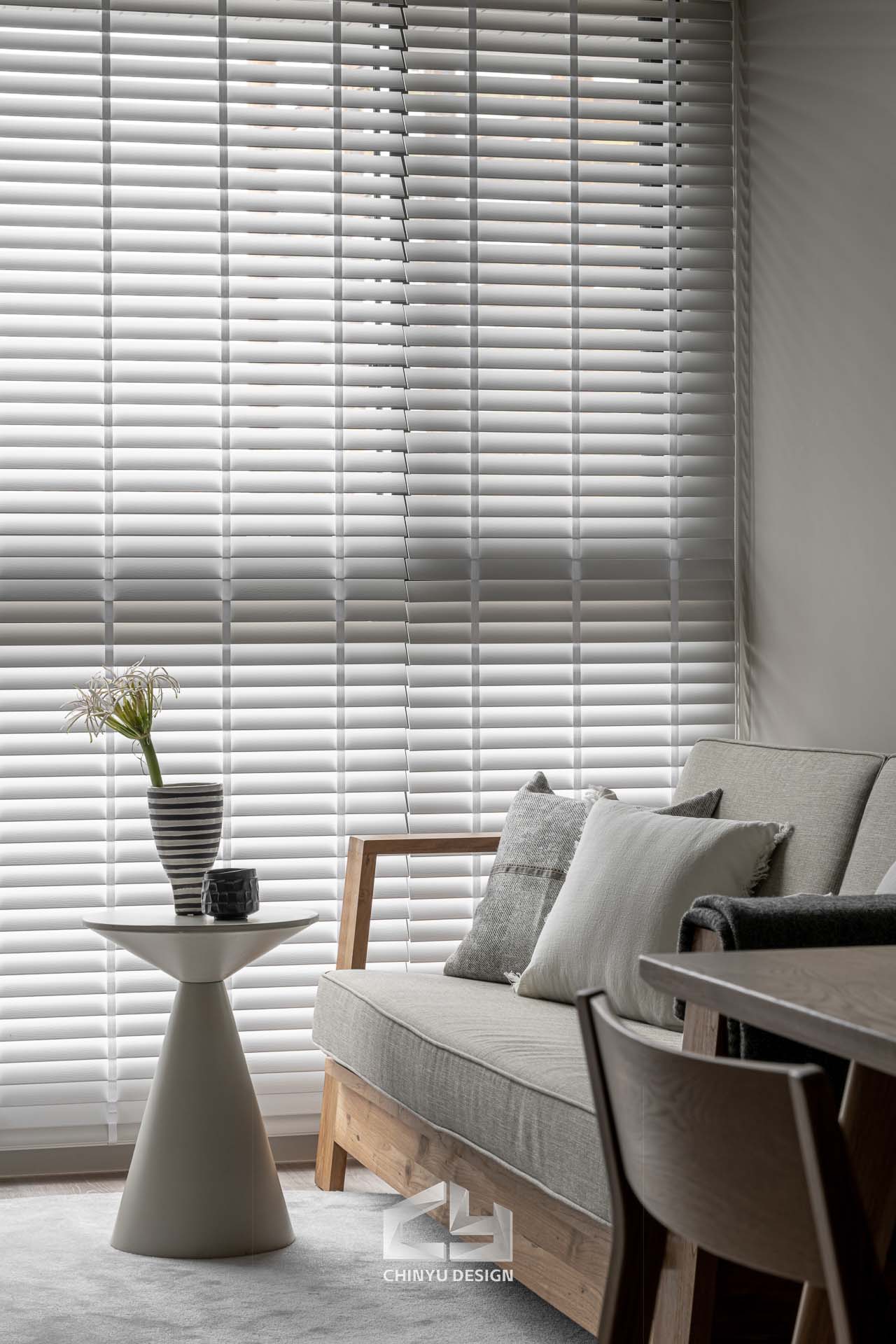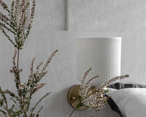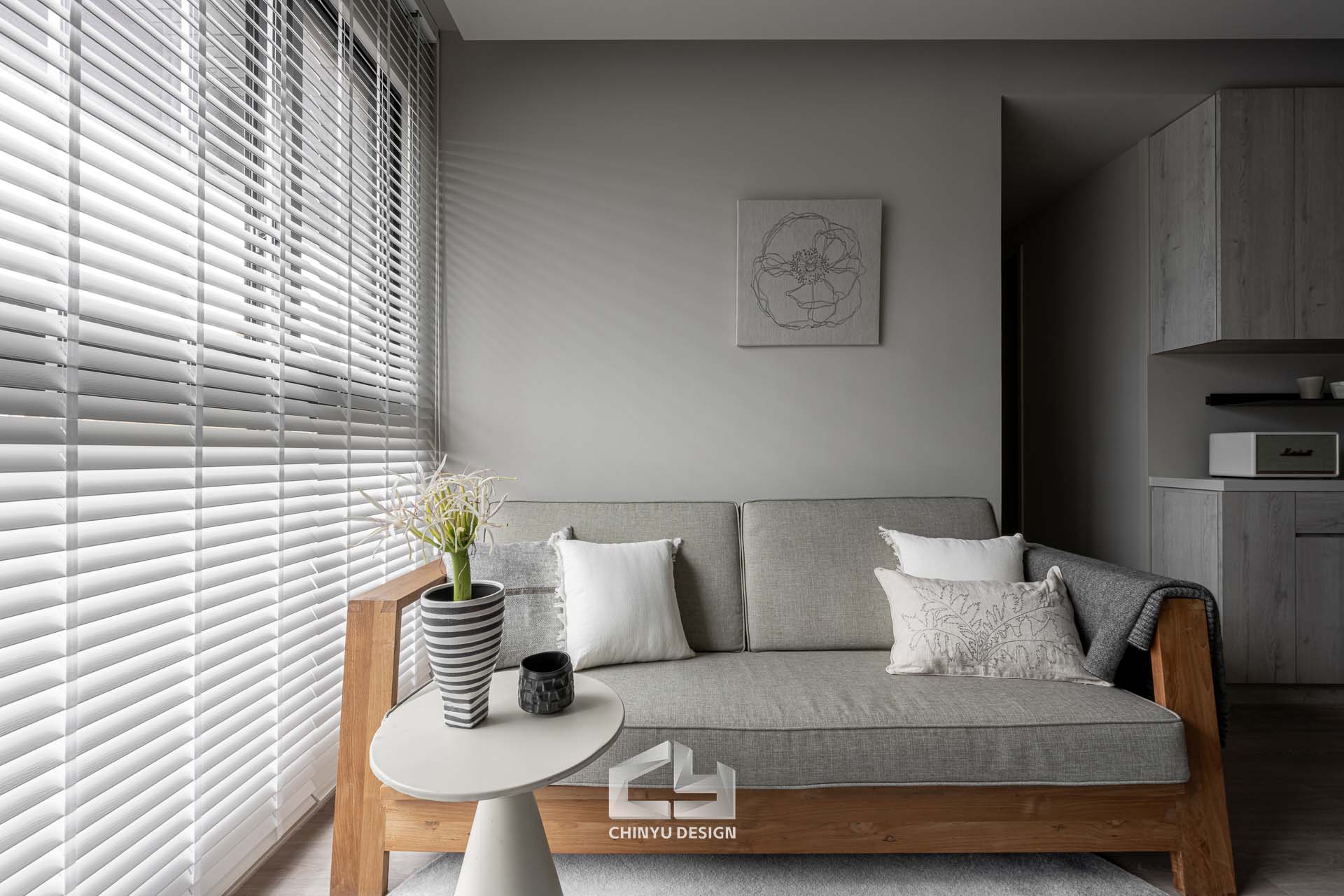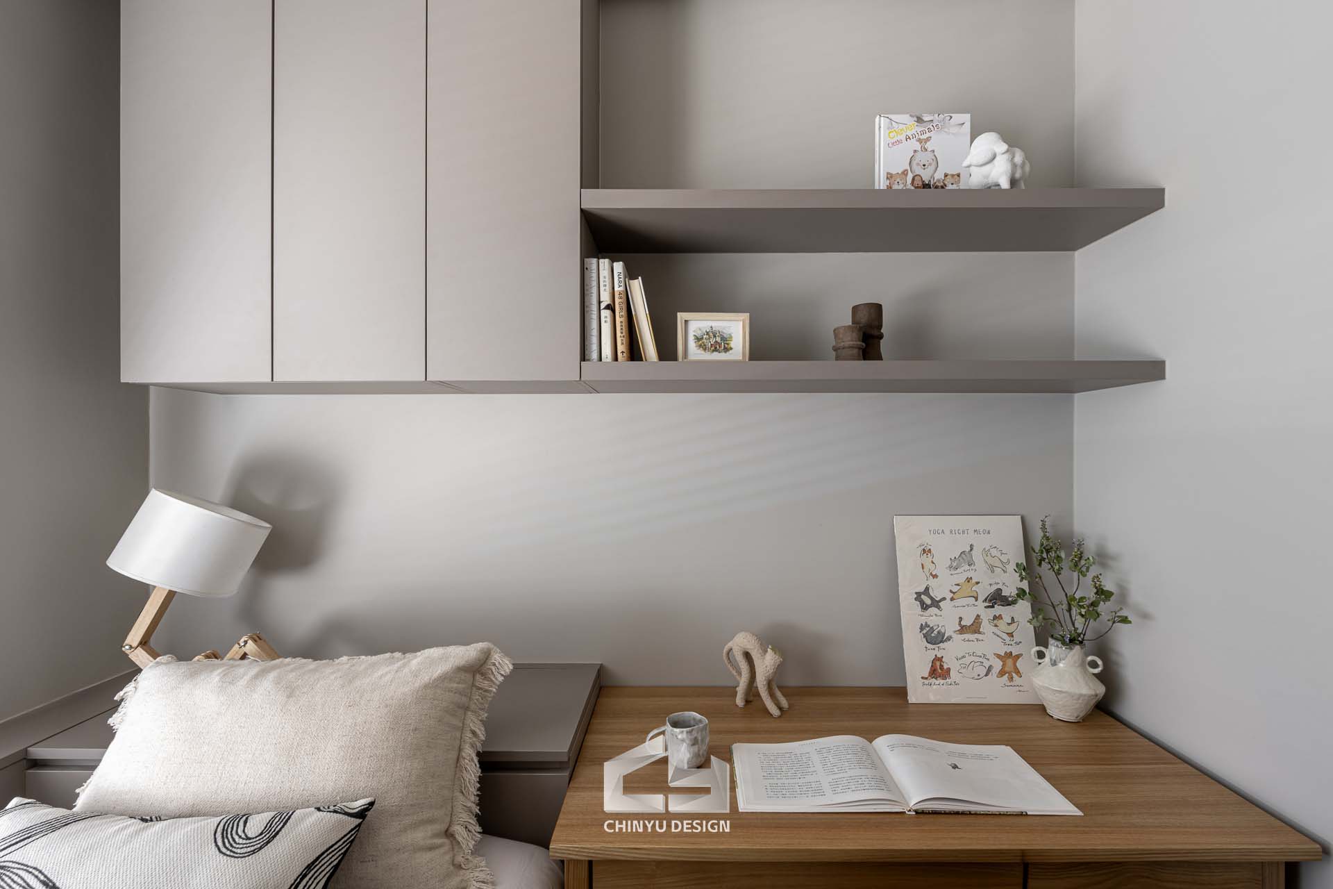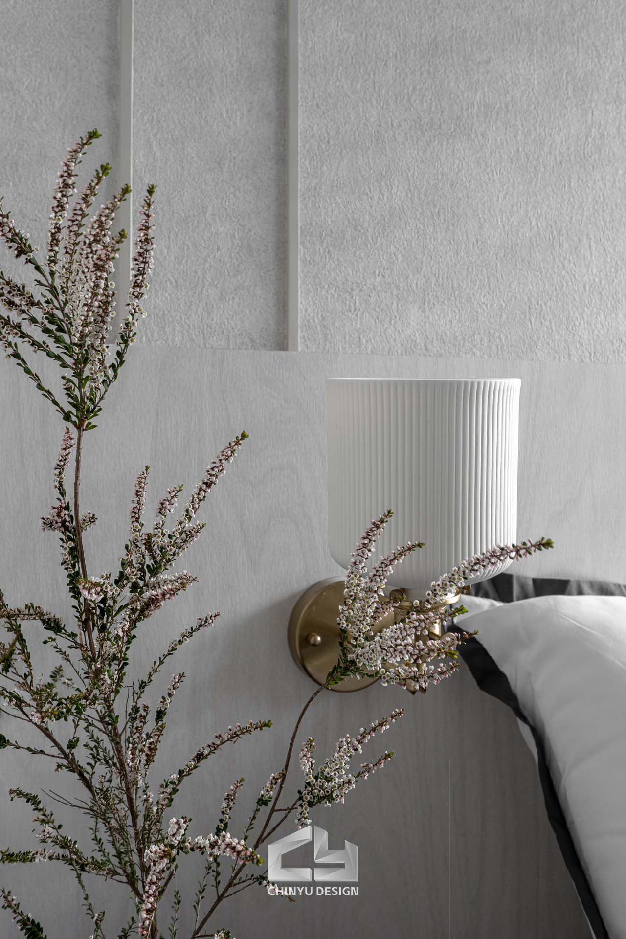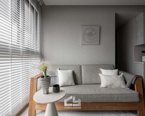 臥室整體以灰白色調做主色,加上壁紙與實木的線條設計,讓小空間保持清爽,搭配木質家具讓空間更溫暖有層次。