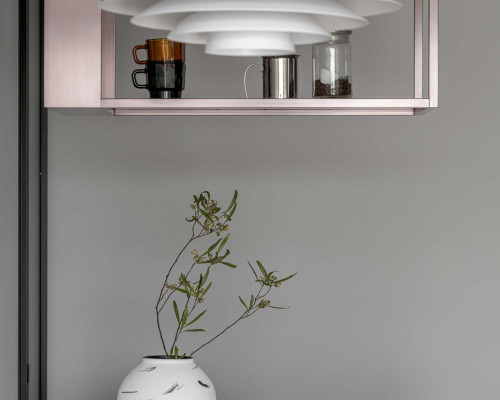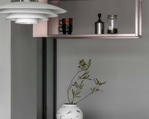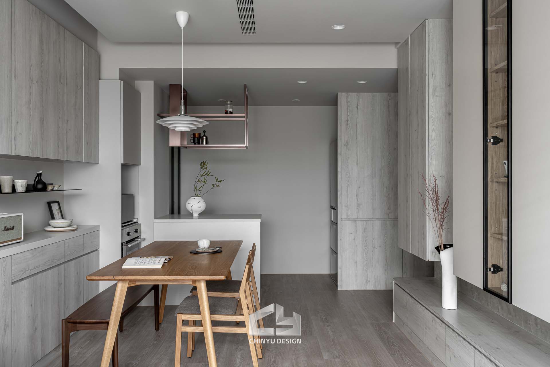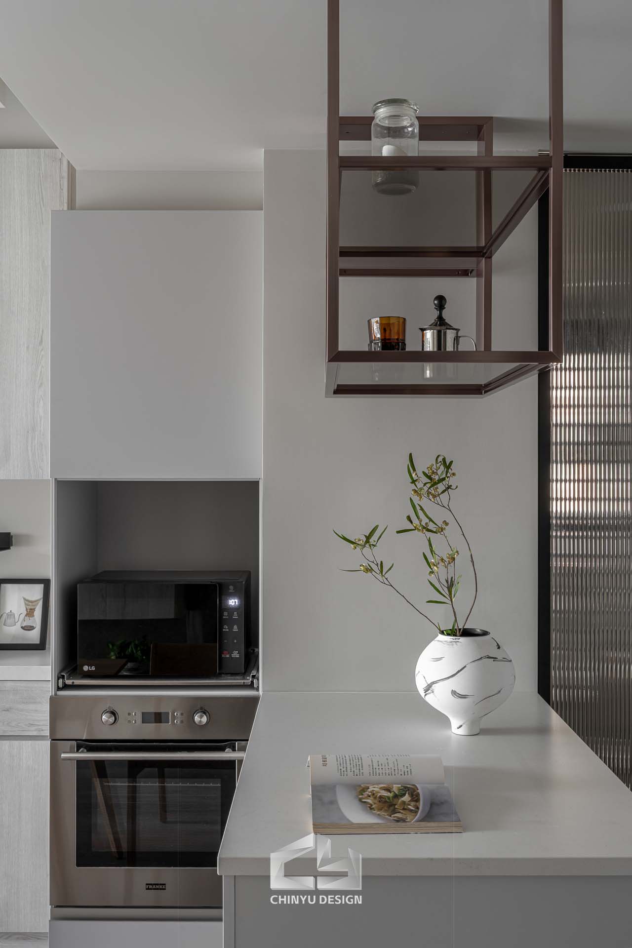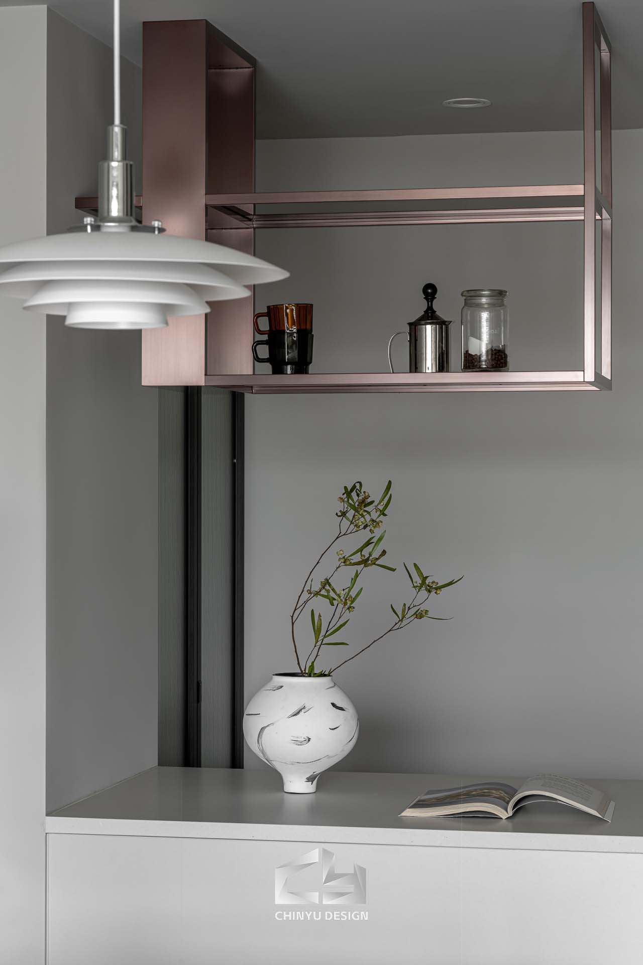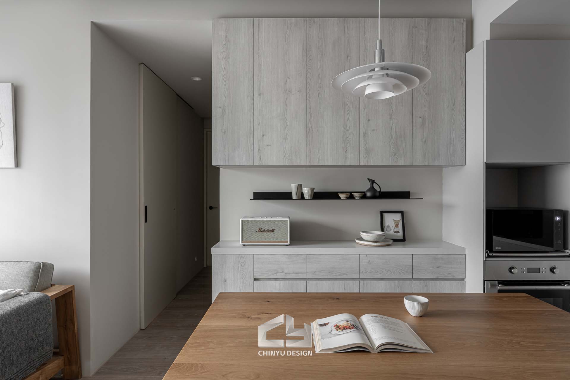 女主人熱愛烘焙與手沖咖啡,因此設計了兼具操作與展示的中島,搭配茶色玻璃與金屬架構,既能使用也能展現美感。在餐桌後方設計一塊展示區,擺放他們從各地蒐集回來的回憶,再擺上一台音響,享受悠閒的下午茶時光。